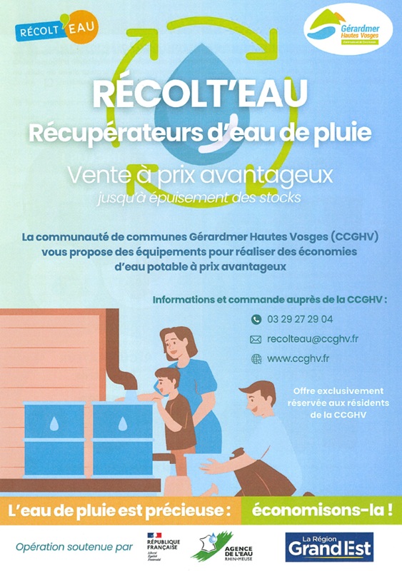 La communauté de communes Gérardmer Hautes Vosges (CCGHV) lance une opération de vente de récupérateurs d’eau de pluie à tarifs préférentiels avec le soutien financier de l’agence de l’Eau Rhin Meuse et de la région Grand Est. Trois modèles de cuves (collecteur de gouttière et kit hydro-économe inclus) vous sont proposés dans deux coloris chacune.